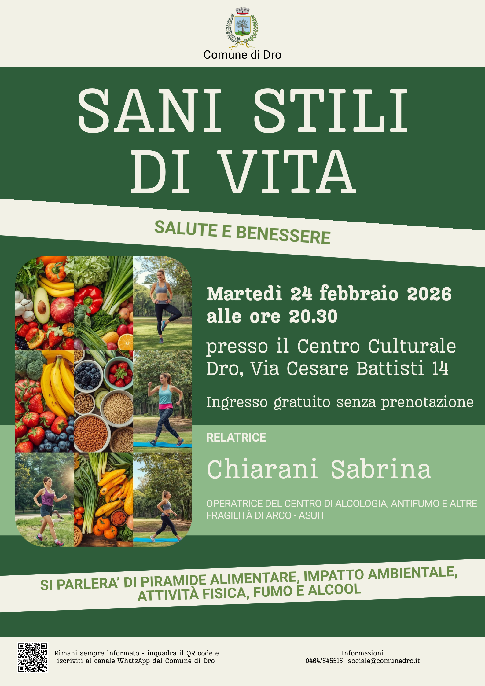 Il Comune di Dro invita alla serata "Sani stili di vita" che si terrà martedì 24 febbraio 2026 presso il Centro Culturale in via Cesare Battisti n. 14.