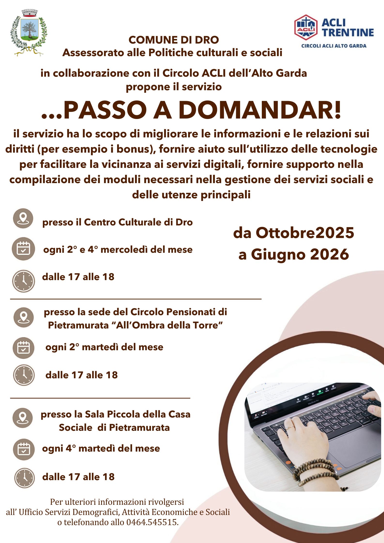Il servizio ha lo scopo di migliorare le informazioni e le relazioni sui diritti (per esempio i bonus), fornire aiuto sull’utilizzo delle tecnologie per facilitare la vicinanza ai servizi digitali, fornire supporto nella compilazione dei moduli necessari nella gestione dei servizi sociali e delle utenze principali.