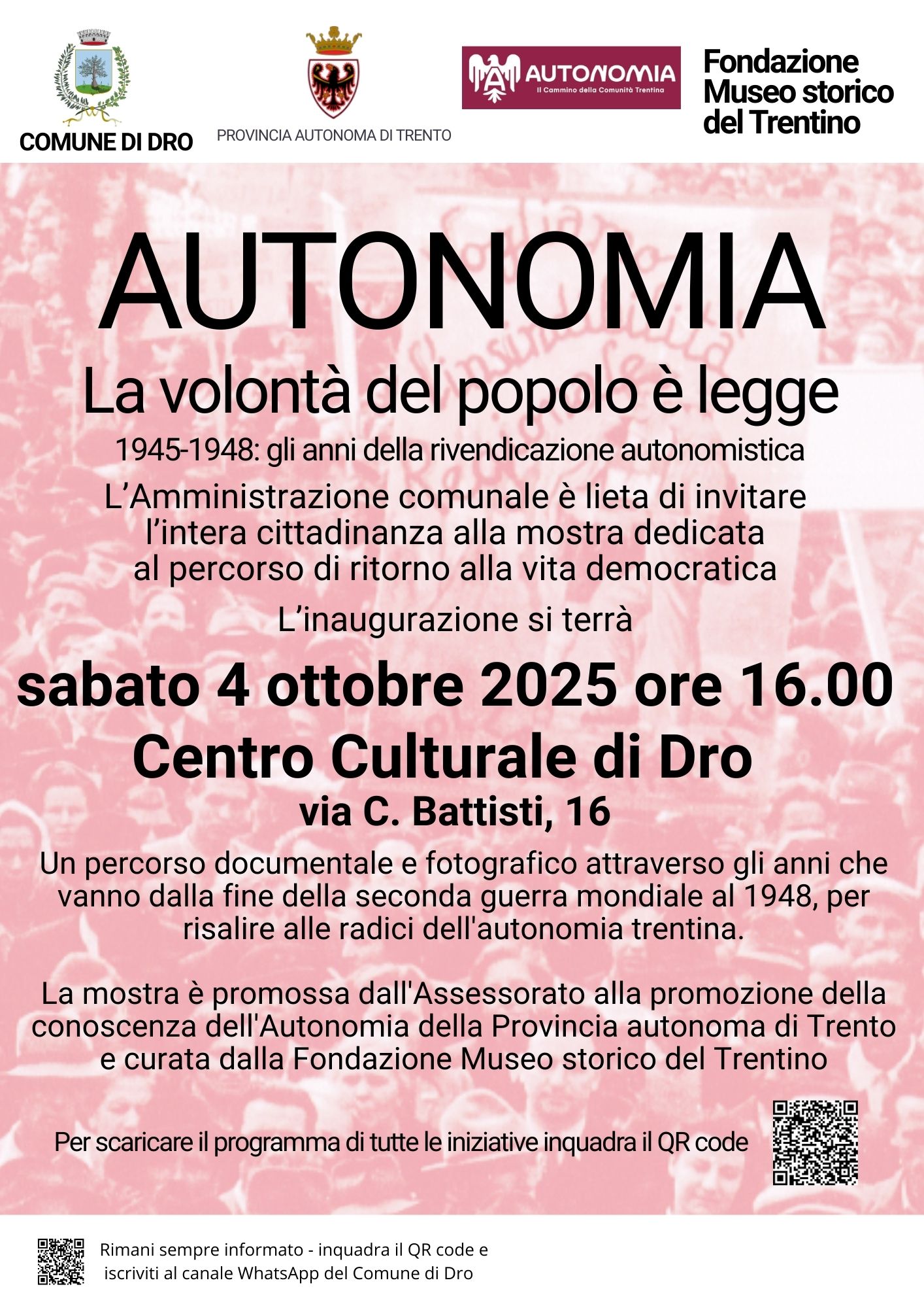 La mostra/installazione dal titolo “Autonomia. La volontà del popolo è legge. 1945-1948: gli anni della rivendicazione autonomistica”, curata dalla Fondazione Museo storico del Trentino e promossa dall’Assessorato provinciale alla promozione della conoscenza dell’Autonomia, si terrà presso la sala “Donna Fior” del Centro Culturale di Dro e sarà gratuita e accessibile dal 4 ottobre al 31 ottobre 2025, in orario di apertura della Biblioteca comunale.