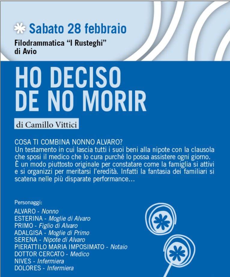 Cos'è Rassegna teatrale con spettacolo Ho deciso de no morir, di Camillo Viticci.Filodrammatica "I Rusteghi" Avio