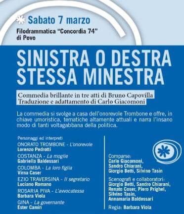 Cos'è Rassegna teatrale con spettacolo Sinistra o destra, stessa minestra, di Bruno CapovillaFilodrammatica "Concordia 74" di Povo