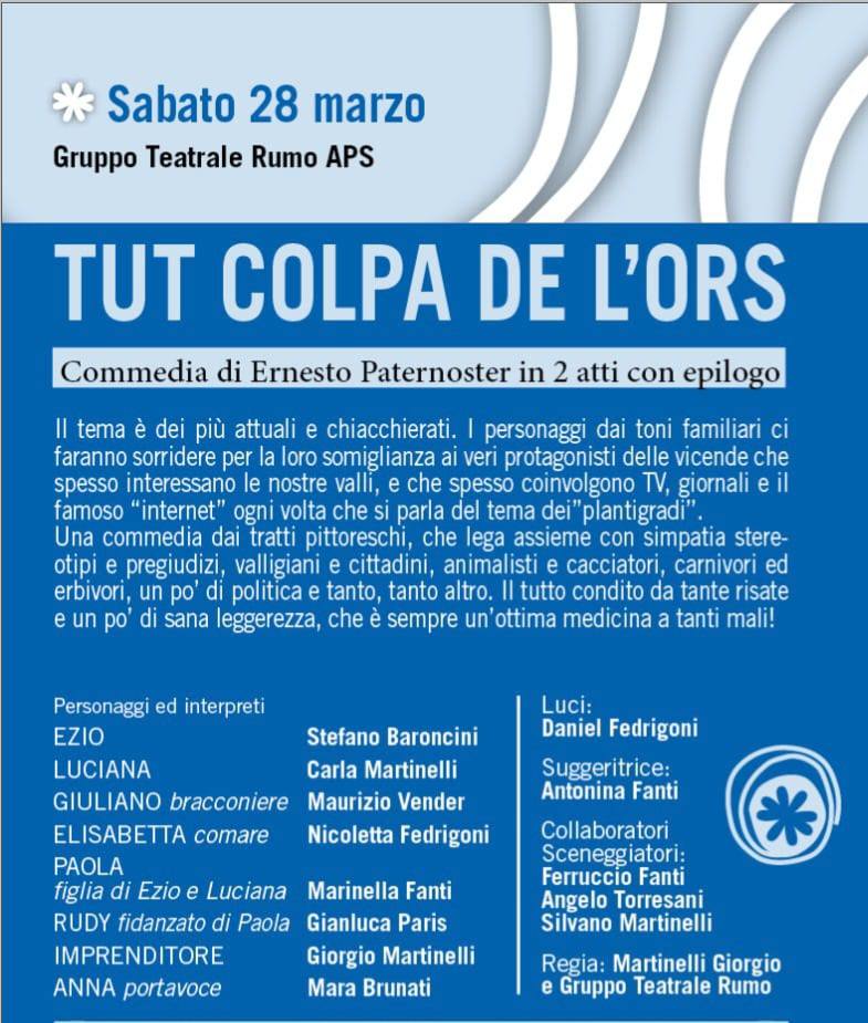 Cos'è Rassegna teatrale con spettacolo Tut colpa de l'ors, di Ernesto Paternoster.Gruppo teatrale Rumo APS