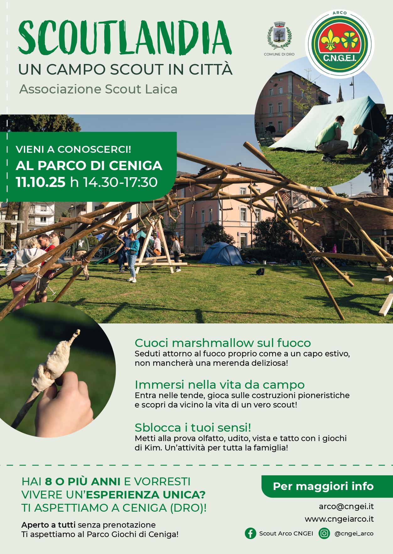 L'associazione CNGEI Sezione Scout Arco APS organizza SCOUTLANDIA, un evento che prevede la realizzazione di un vero e proprio campo scout aperto a tutti/e i/le bambini/e ed ai/lle ragazzi/e che abbiano voglia di conoscere da vicino la vita degli scout. Potranno arrampicarsi sui ponti di Leonardo realizzati con incastri, camminare sospesi su tavole, andare sull’altalena scout e cuocersi il pane ed i marshmallows al fuoco di bivacco. Infine, potranno provare l’ebbrezza di sostare per un breve riposo all’interno di tende da campo.